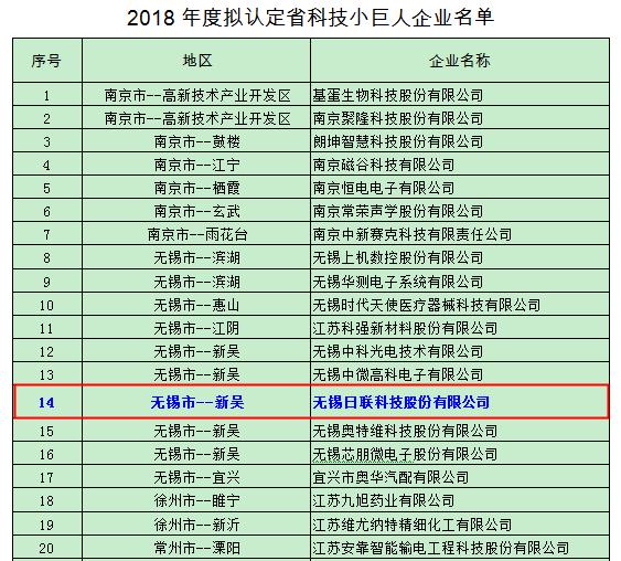 近日,江蘇省專精特新小巨人企業擬認定名單在江蘇省經信委網站公示,此資質經過企業申報、各地經信部門審核推薦、第三方機構審查、專家評審等環節,無錫市共有10家單位入選“江蘇省科技小巨人企業”,無錫日聯科技股份有限公司榮獲榜單。這也是江蘇省認定一批具有一定規模、創新性強、增長潛力大的創新型企業,推動江蘇省經濟轉型升級的中堅力量。